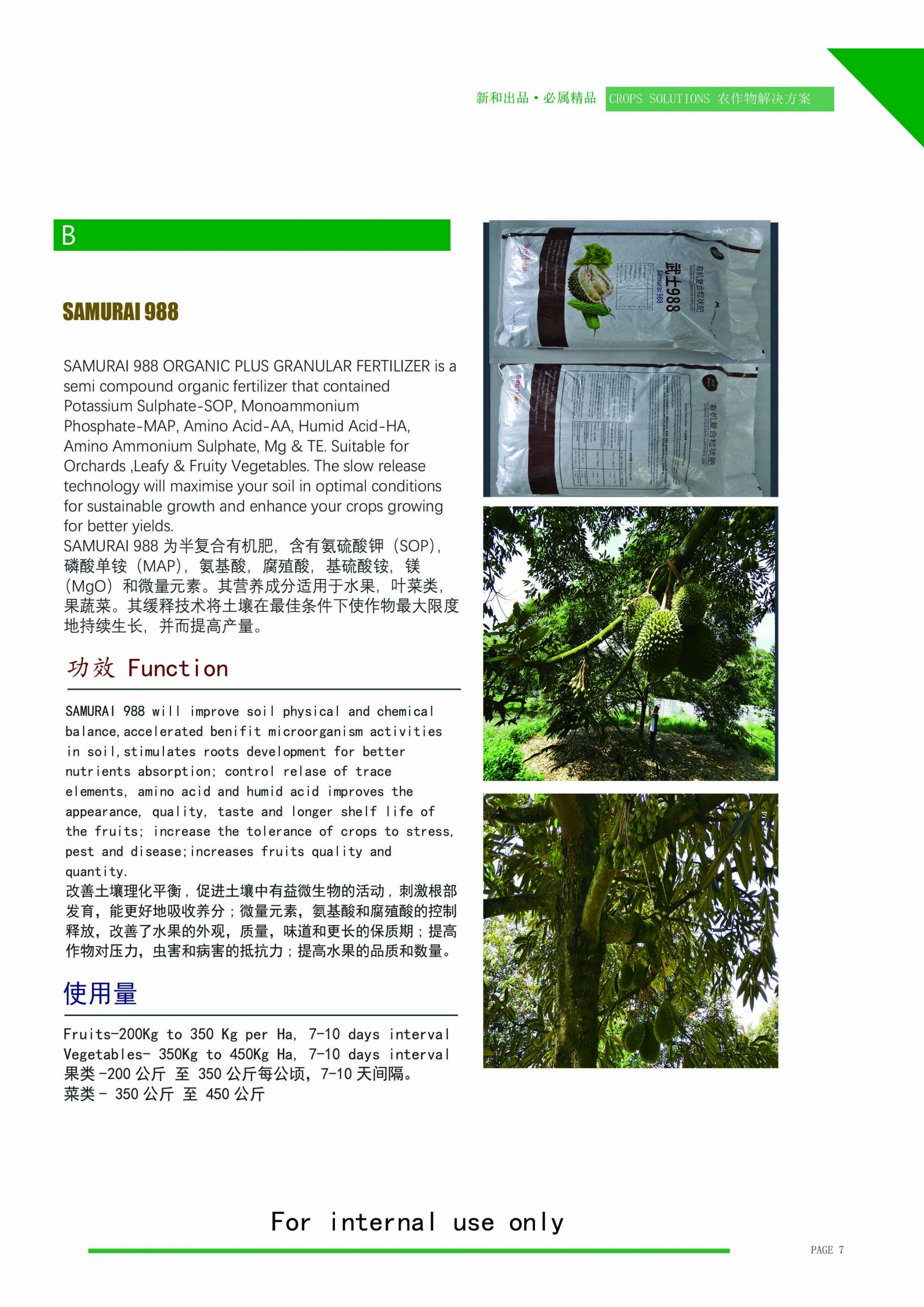SAMURAI 988 Posted by singhope On 30 March, 2018 11 June, 2021 Home » Products » SAMURAI 988 Organic Plus SOP for Durian Grow Product Description SAMURAI 988 See also different: NATURFRUIT NATURAVITAL WSP ALGEA 21st SEAWEED EXTRACT Take good care from young state and fruiting period. << return to products